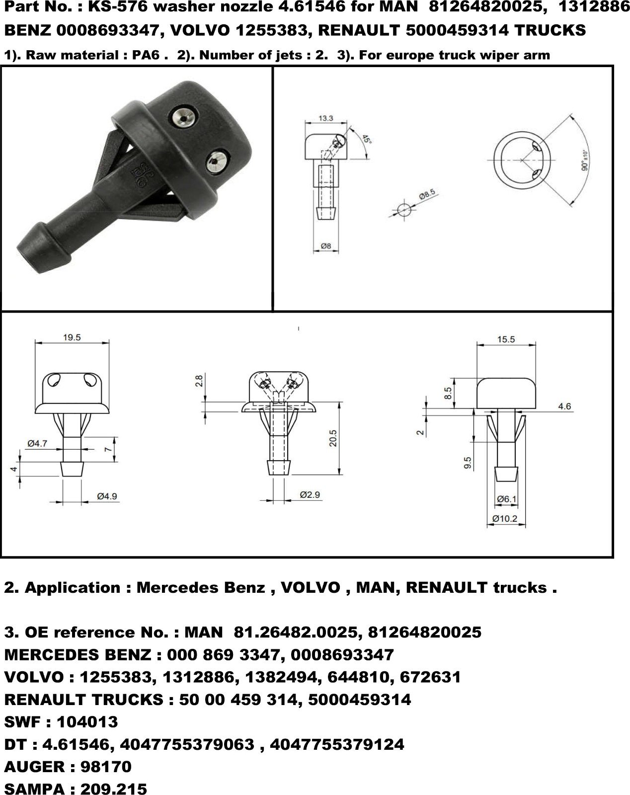KS-576 washer nozzle 4.61546 for MAN 81264820025, 1312886 MERCEDES BENZ 0008693347, VOLVO 1255383, RENAULT 5000459314 TRUCKS