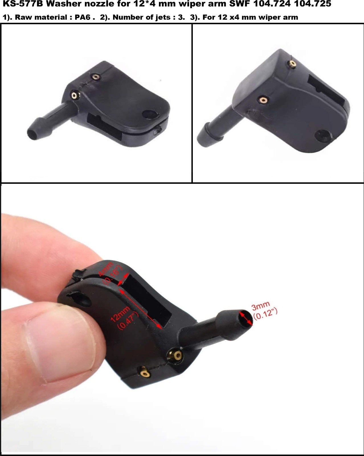 KS-577B washer nozzle for 12 x 4 mm mono wiper arm , SWF No. : 104.724 , 104.725 .